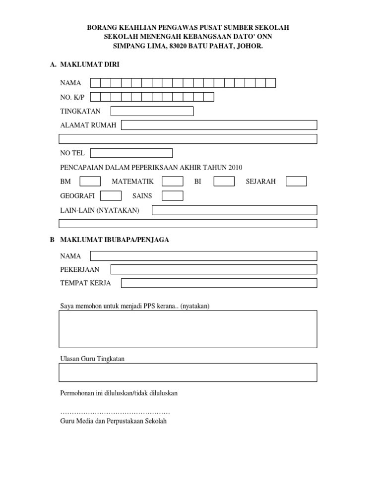 Contoh Borang Keahlian Perpustakaan Sekolah